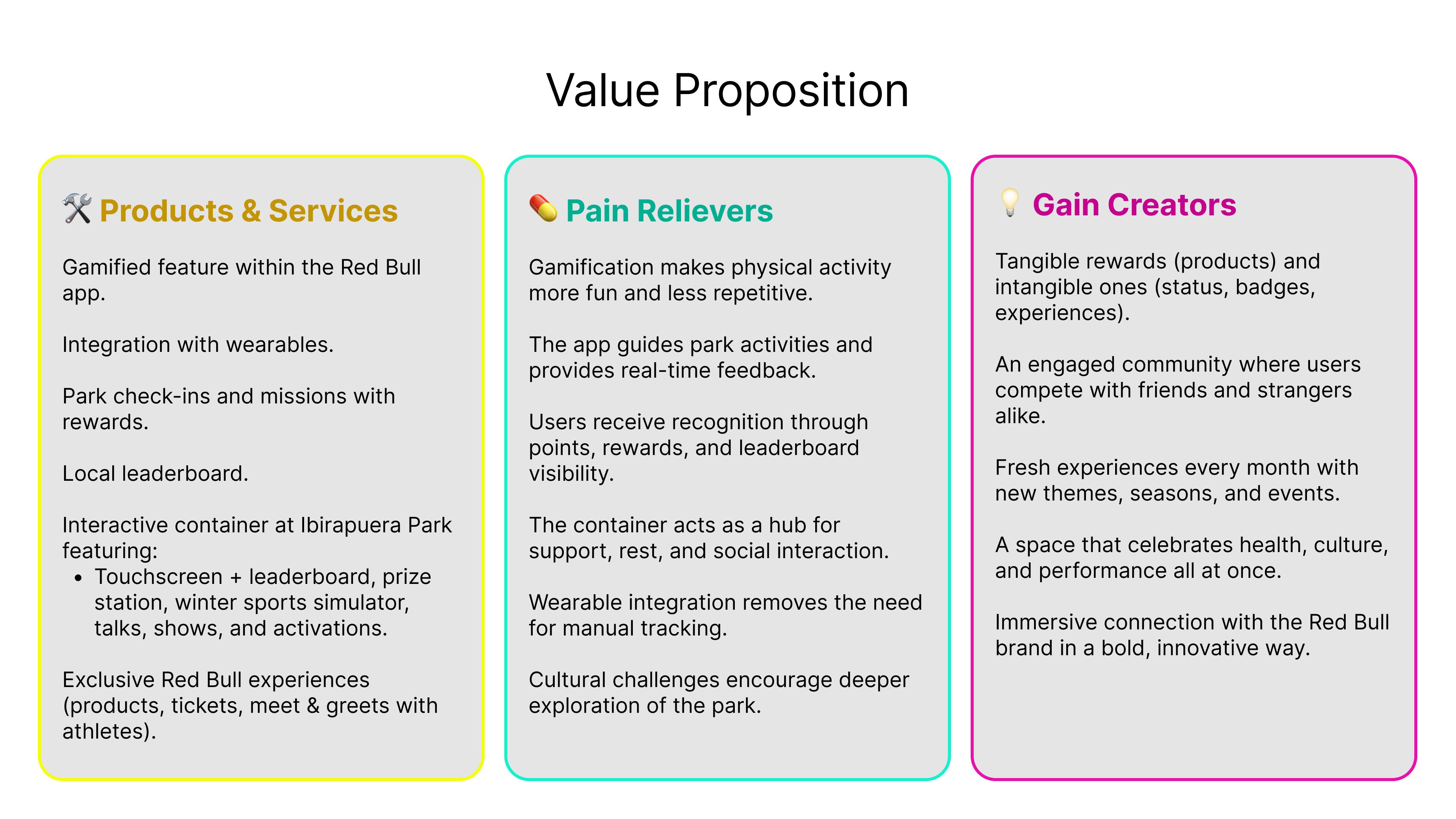 Based on these insights, I created a Business Model Canvas to structure the business proposal, followed by a Value Proposition Canvas to clearly identify user pains, gains, and opportunities to connect the brand with its audience.