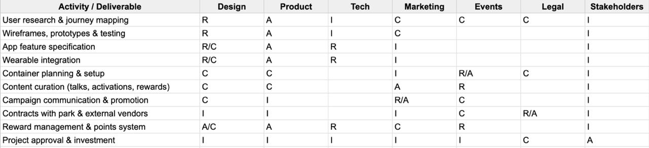I applied a RACI Matrix (Responsible, Accountable, Consulted, Informed) to define clear roles across all teams, ensuring efficient communication and avoiding task overlap.