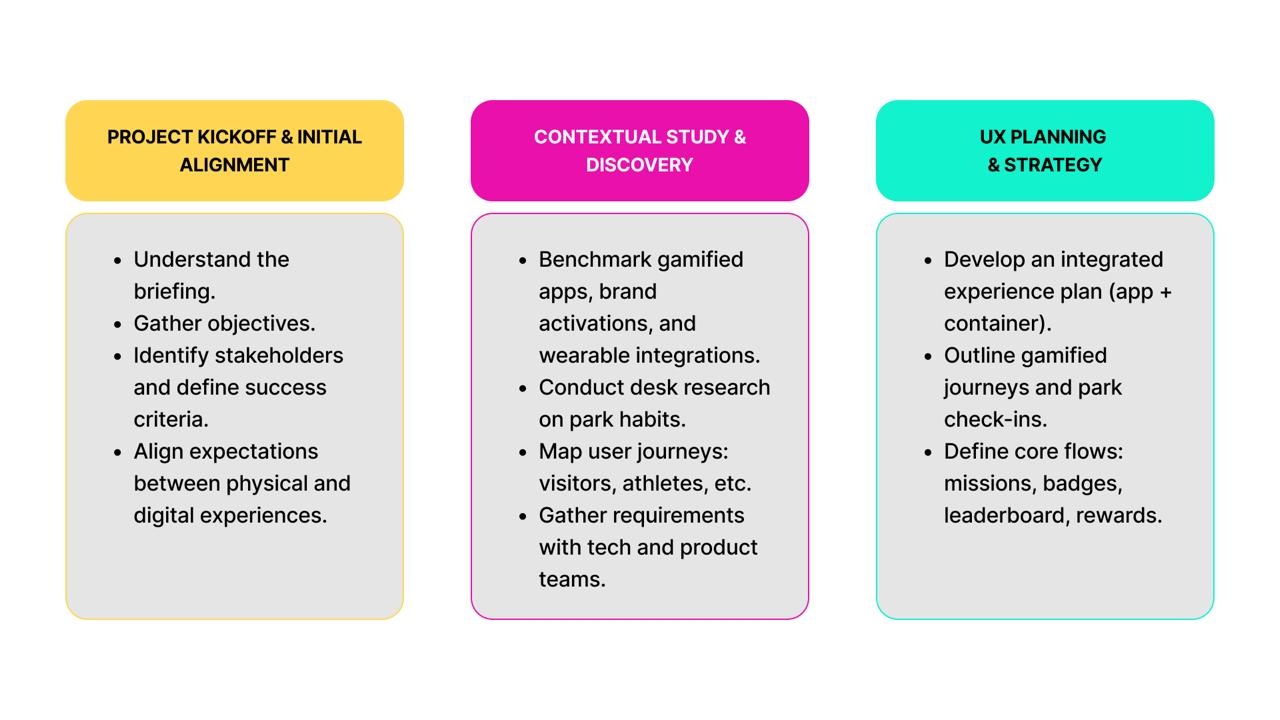 The implementation plan outlines the full project flow, from initial request to post-launch, covering discovery, ideation, prototyping, testing, QA, and monitoring. This structure helped align multidisciplinary teams (product, design, tech, marketing) and ensured consistency between physical and digital experiences.